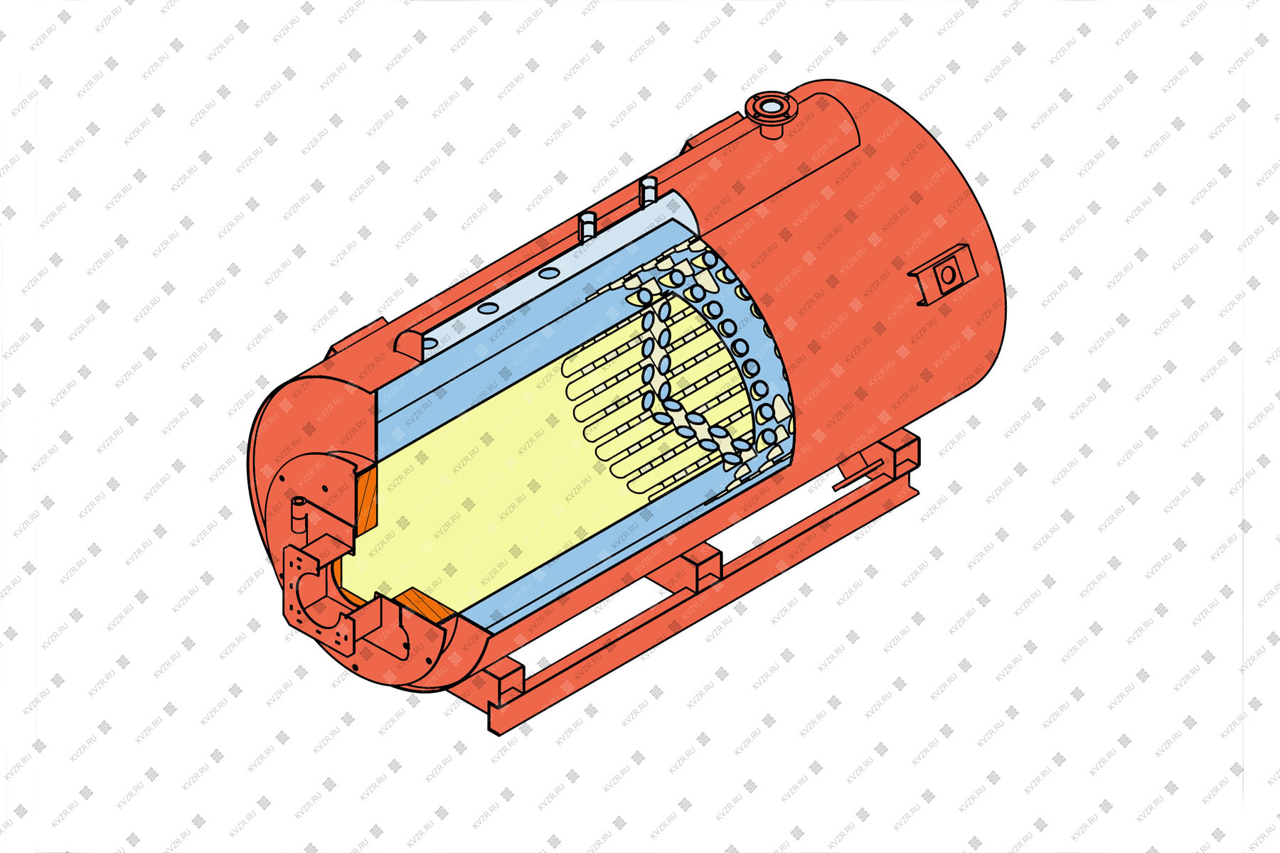 Трубный пучок соединяет верхнюю и нижнюю часть водяной рубашки агрегата, пар высокого давления образуется при испарении нагреваемой воды и собирается в верхней его части, в сборной камере, далее направляется на технологические нужды.